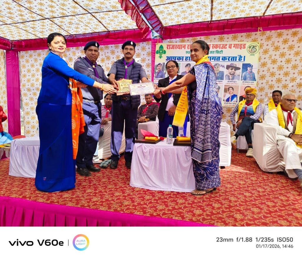 शिविर में उपस्थित अतिथियों द्वारा विभिन्न विद्यालयों के स्काउट गाइड टेंट का निरीक्षण करके वरीयता के आधार पर श्रेष्ठ यूनिट को सम्मानित किया गया। इस अवसर पर नन्ही बालिका सिया लखावत को हीरक पंख पुरस्कार प्राप्त होने पर विशेष अभिनंदन किया गया। कार्यक्रम के अंत में शिविर प्रभारी हेमंत कुमार परिहार द्वारा उपस्थित समस्त अतिथियों और भामाशाहों का आभार व्यक्त किया गया। कार्यक्रम का सरल संचालन व्याख्याता गजेंद्र गर्ग द्वारा किया गया।