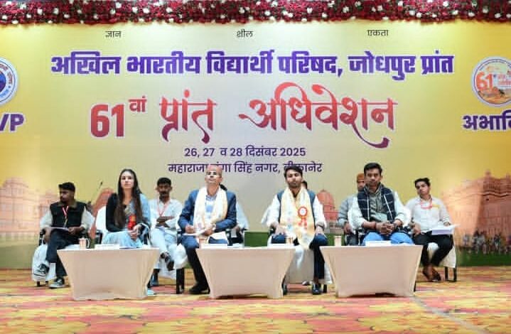 सोजत। अखिल भारतीय विद्यार्थी परिषद (एबीवीपी) जोधपुर प्रान्त का 61वां प्रान्त अधिवेशन बीकानेर में सम्पन्न हुआ। अधिवेशन में संगठनात्मक दायित्वों की घोषणा की गई, जिसमें सोजत के कार्यकर्ताओं को महत्वपूर्ण जिम्मेदारियाँ सौंपी गईं।