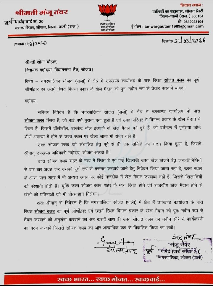 ज्ञापन में बताया गया कि उपखण्ड कार्यालय के समीप स्थित सोजत क्लब कई वर्षों पुराना है और इसके परिसर में विभिन्न खेल मैदान भी मौजूद हैं। हालांकि वर्तमान में क्लब और मैदानों की स्थिति अत्यंत जर्जर हो चुकी है, जिससे खिलाड़ियों को काफी परेशानी का सामना करना पड़ रहा है। पहले यहां बड़ी संख्या में युवा खेल गतिविधियों में भाग लेते थे, लेकिन अब बदहाल हालात के चलते यह लगभग निष्क्रिय हो चुका है।