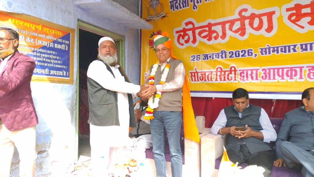 सोजत। हजरत नुरशाह बाबा मस्तान शाह बाबा दरगाह परिसर में संचालित मदरसा नुरानी प्राथमिक विद्यालय में 77वां गणतंत्र दिवस हर्षोल्लास और देशभक्ति के जोश के साथ मनाया गया। सुबह झंडारोहण के साथ कार्यक्रम का शुभारंभ हुआ, जिसमे नन्हे-मुन्ने छात्र-छात्राओं ने देशभक्ति गीतों और नृत्यों की मनमोहक प्रस्तुतियां दीं। बच्चों की प्रस्तुतियों ने उपस्थित दर्शकों की जमकर तालियां बटोरीं।