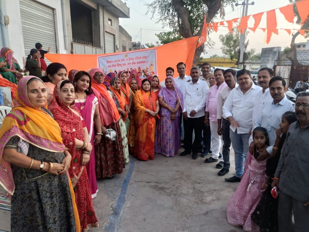 कार्यक्रम की शुरुआत में राम भगवान के समक्ष दीप जलाकर राम मंदिर परिसर पर आयी महिलाओं का तिलक लगाकर स्वागत किया गया। सप्त दिवस से जो महिलाए गणगौर माता को पानी पिलाने व घुमाने का कार्य कर रही थी उन मातृ शक्ति का भगवा दुप्पटा व माला पहनाकर स्वागत किया गया।
