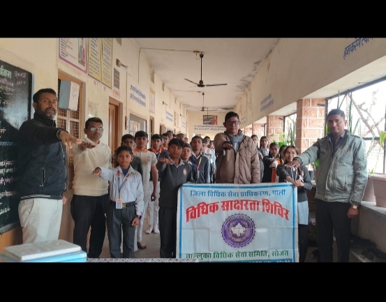 सोजत। माननीय राजस्थान राज्य विधिक सेवा प्राधिकरण, जयपुर के तत्वावधान तथा जिला विधिक सेवा प्राधिकरण, पाली के निर्देशानुसार एवं तालुका विधिक सेवा समिति, सोजत के आदेशानुसार गुरुवार 29 जनवरी 2026 को आदर्श विद्या मंदिर माध्यमिक विद्यालय, सोजत में विधिक जागरूकता शिविर का आयोजन किया गया। शिविर में पीएलवी श्री सांवल प्रभात व्यास द्वारा विद्यार्थियों व प्रतिभागियों को शपथ दिलाकर विभिन्न विधिक विषयों पर जागरूक किया गया।