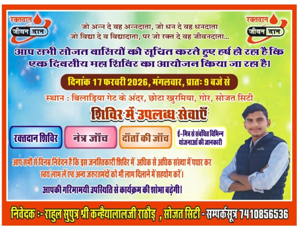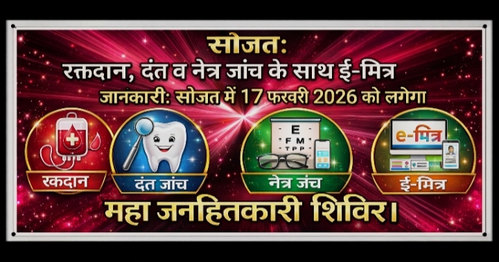 सोजत: रक्तदान, दंत व नेत्र जांच के साथ ई-मित्र कि जानकारी: सोजत में 17 फरवरी 2026 को लगेगा महा जनहितकारी शिविर।