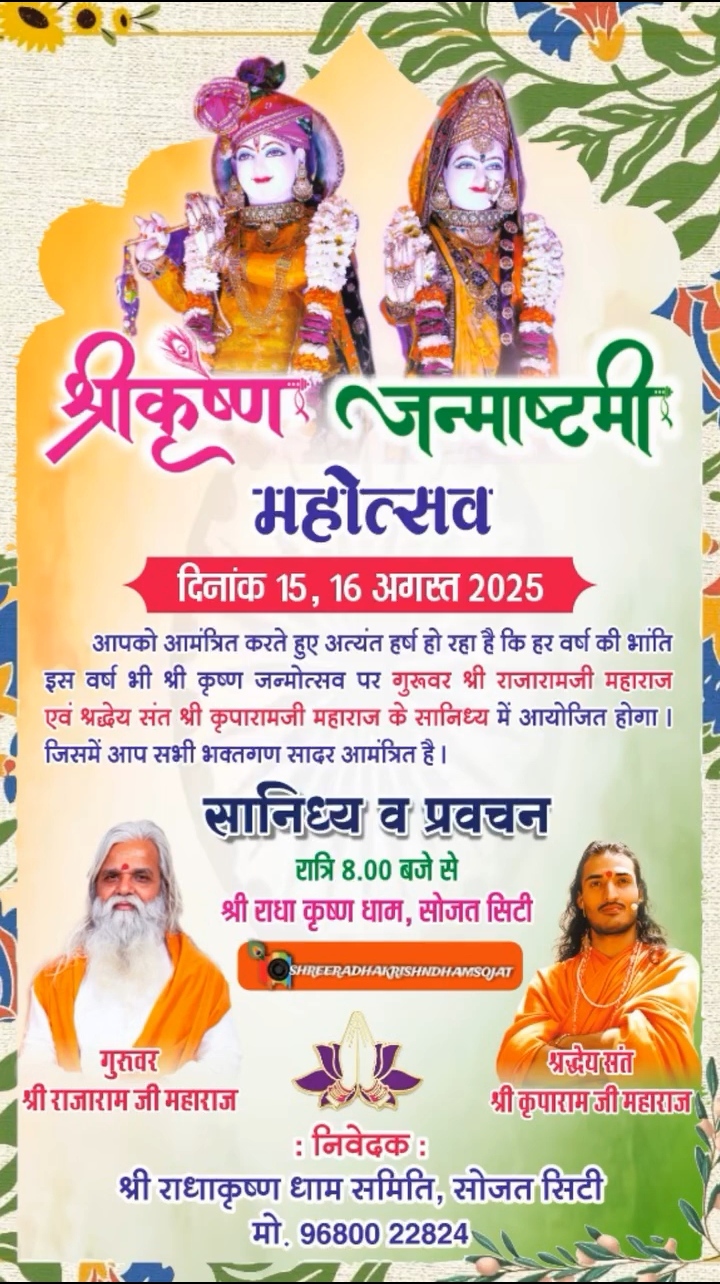 सोजत। शहर के कृषि मंड़ी रोड पर स्थित श्री राधाकृष्ण धाम में हर वर्ष की तरह इस बार भी श्रीकृष्ण जन्माष्टमी महोत्सव पूरे उत्साह और श्रद्धा के साथ मनाया जाएगा।