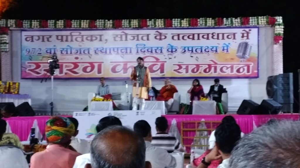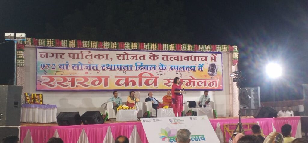 सोजत। नगर की 972वीं स्थापना वर्षगांठ पर नगर पालिका द्वारा आयोजित सोजत महोत्सव के अंतर्गत बुधवार देर रात रामेराव तालाब परिसर में रसरंग कवि सम्मेलन आयोजित हुआ। देशभर से आए नामचीन कवियों ने देशभक्ति, हास्य, ओज और श्रृंगार रस की रचनाओं से श्रोताओं को देर रात तक बांधे रखा।