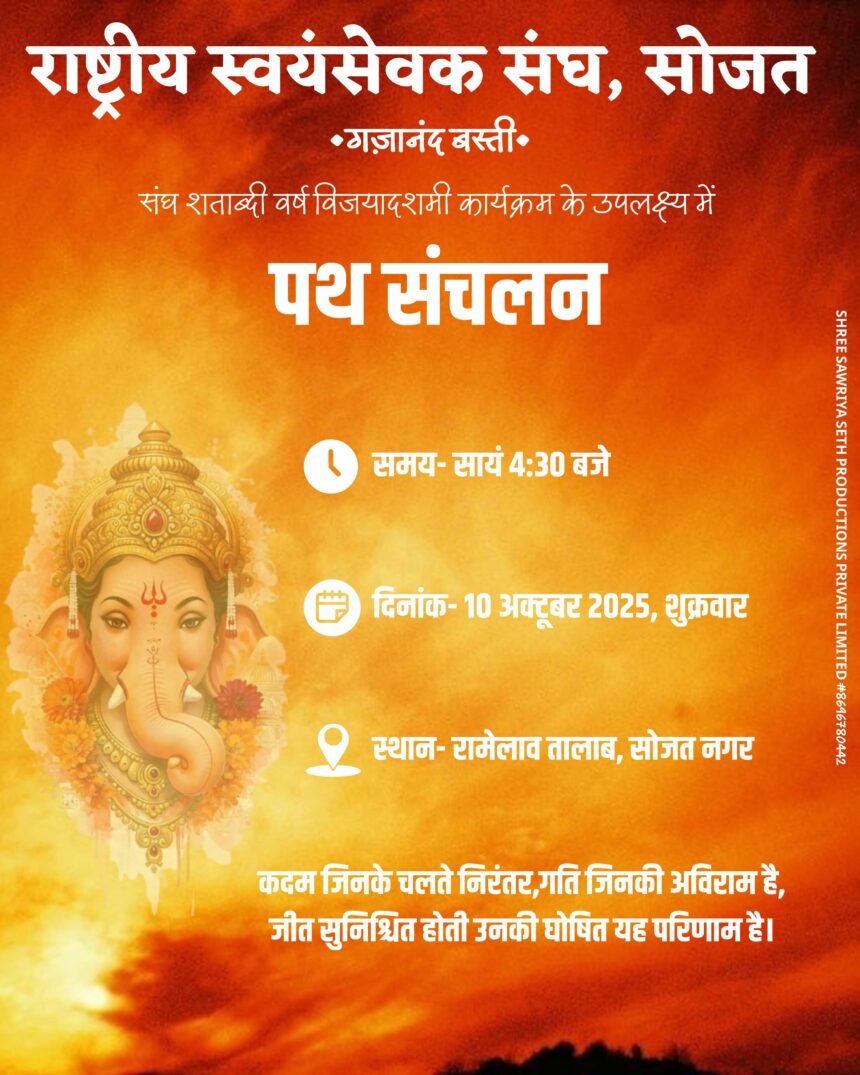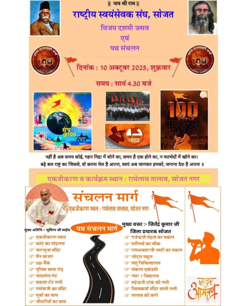 सोजत। राष्ट्रीय स्वयंसेवक संघ के 100वें स्थापना दिवस एवं विजयदशमी उत्सव के उपलक्ष्य में सोजत शहर में विशेष कार्यक्रम का आयोजन किया जा रहा है। कार्यक्रम के अंतर्गत दिनांक 10 अक्टूबर 2025, शुक्रवार को सायं 4:30 बजे गजानन बस्ती स्थित तालाब की बारी से पथ संचलन की शुरुआत होगी।