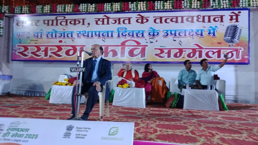 सोजत महोत्सव 2025 में न.पा.सोजत द्वारा कवि सम्मेलन : कवियों की हास्य,व्यंग और ओजस्वी कविताओं ने बांधा समां,पद्मश्री सुरेंद्र शर्मा रहे मुख्य आकर्षण।